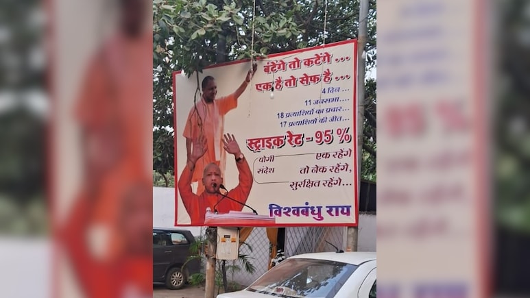 मुंबई के अंधेरी की सड़कों पर लगे पोस्टरों में सीएम योगी की फोटो छपी है. इस पर 'बंटेंगे तो कटेंगे' और 'एक है तो सेफ है' (पीएम मोदी का नारा) लिखा हुआ है. इसके साथ ही होर्डिंग पर ये भी लिखा है कि 4 दिन में 11 जनसभाएं कीं. उन्होंने 18 प्रत्याशियों के लिए प्रचार किया,जिनमें 17 की जीत हुई है. स्ट्राइक रेट 95% है. साथ ही इसमें योगी का संदेश 'एक रहेंगे तो नेक रहेंगे,सुरक्षित रहेंगे' भी लिखा हुआ है.