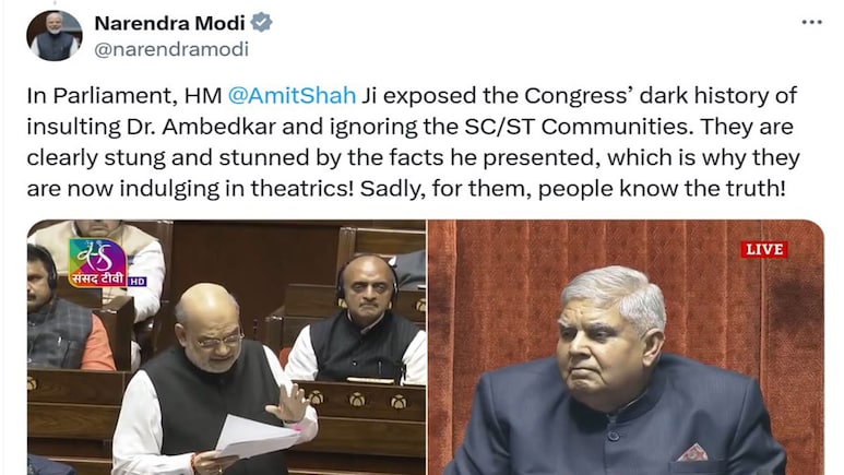 गृहमंत्री अमित शाह (Home Minister Amit Shah) के बाबा साहब भीमराव आंबेडकर को लेकर दिए गए बयान पर घमासान मचा है. विपक्षी दलों ने संसद में सरकार पर जोरदार हमला बोला. अब इस मुद्दे पर पीएम मोदी ने अमित शाह का बचाव किया है.प्रधानमंत्री ने सोशल मीडिया साइट एक्स पर लिखा है कि कांग्रेस और उसका सड़ा हुआ इकोसिस्टम सोचता है कि उनके दुर्भावनापूर्ण झूठ कई वर्षों के उनके कुकर्मों को छिपा सकते हैं. पीएम ने लिखा कि खासकर डॉ.आंबेडकर का जो कांग्रेस ने अपमान किया था उसे छिपा लेंगे अगर वो ये सोचते हैं तो वो उनकी गलतफहमी है. भारत के लोगों ने बार-बार देखा है कि कैसे एक परिवार के नेतृत्व वाली एक पार्टी ने डॉ. अंबेडकर की विरासत को मिटाने और एससी/एसटी समुदायों को अपमानित करने के लिए हर संभव गंदी चाल चली है.