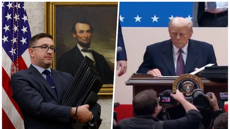फाइलें लिए खड़ा वाइट हाउस का कर्मचारी और दनादन साइन करते डोनाल्ड ट्रंप... अमेरिकी में सोमवार शाम को शपथ लेने के बाद ट्रंप ने देर रात तक कई आदेशों पर हस्ताक्षर किए. इस दौरान वाइट हाउस के ओवल रूप में नजारा बड़ा दिलचस्प था. ट्रंप की प्रेस सेक्रटरी समते उनके ऑफिस के कई कर्मचारी कमरे में मौजूद थे और ट्रंप फाइलों पर एक के बाद एक साइन किए जा रहे थे. राष्ट्रपति पद के शपथ के ठीक बाद कार्यकारी आदेश की फाइलें लिए राष्ट्रपति ऑफिस का कर्मचारी खड़ा था,जिसमें हाथों में फाइलों का ढेर था.