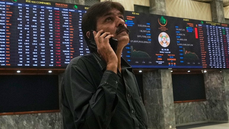 पाकिस्तान के शेयर बाजार (पीएसएक्स) में सोमवार को बेंचमार्क केएसई-100 सूचकांक में 8,000 से अधिक अंक की गिरावट के कारण एक घंटे के लिए कारोबार स्थगित कर दिया गया. एक घंटे की स्थगन अवधि के बाद भी,कारोबार फिर से शुरू होने पर पीएसएक्स में 2,000 अंक की और गिरावट आई और यह रिकॉर्ड 8,600 अंक तक टूट गया. सूचकांक पिछले बंद स्तर से 3,882.18 या 3.27 प्रतिशत की गिरावट के साथ 1,14,909.48 पर बंद हुआ.बांग्लादेश ने ट्रंप के सामने हाथ जोड़े