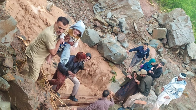 Ramban landslide: रामबन में बाढ़ की तबाही के बीच बच्चे सहित अन्य लोगों को सुरक्षित स्थान पर पहुंचाने की कोशिश में जुटे जवान.