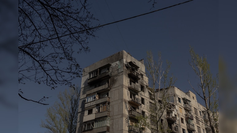 एक आवासीय इमारत जो 20 अप्रैल को पूर्वी डोनेट्स्क क्षेत्र के कोस्त्यंतीनिव्का में हवाई हमलों से भारी क्षतिग्रस्त हो गई थी