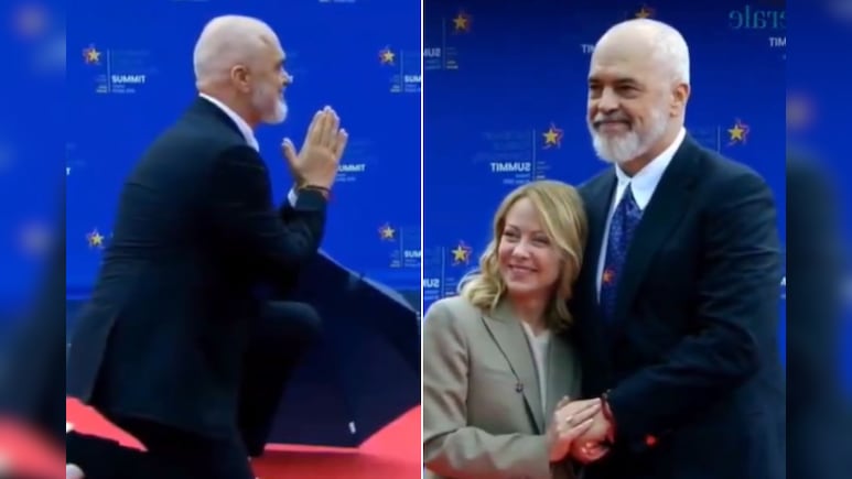 इटली की प्रधानमंत्री जॉर्जिया मलोनी (Giorgia Meloni) और अल्बानिया के प्रधानमंत्री एडी रामा (Albanian PM Edi Rama) का एक वीडियो सोशल मीडिया पर खूब वायरल हो रहा है. इस वीडियो में अल्बानिया के प्रधानमंत्री एडी रामा इटली की पीएम मलोनी के लिए रेड कार्पेट पर घुटनों पर बैठे नजर आ रहे हैं. घुटनों पर बैठे एडी रामा के दोनों हाथ नमस्कार की मुद्रा में जुड़े हैं और सामने से मलोनी आ रही है. एडी रामा तक पहुंचने के बाद मलोनी मुस्कुराती हैं. फिर दोनों नेता बेहद गर्मजोशी से गले मिलते हैं और साथ में फोटोशूट कराते हैं.