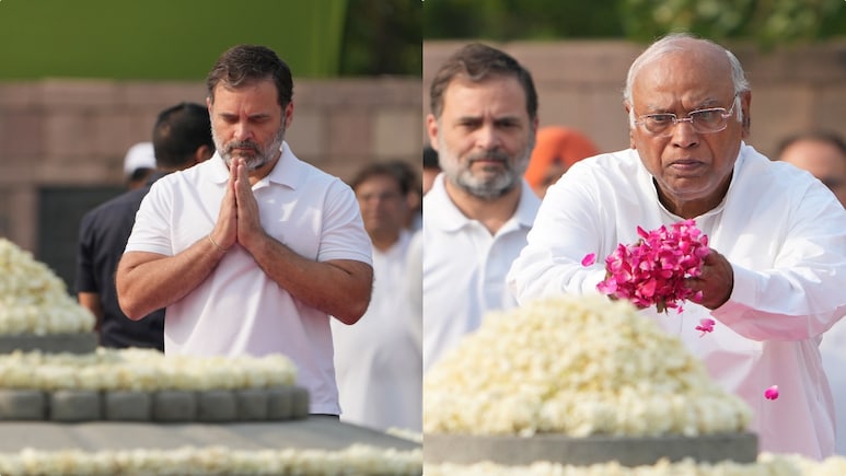 वीर भूमि पर पूर्व पीएम राजीव गांधी की पुण्यतिथि पर श्रद्धांजलि अर्पित करते हुए खरगे और राहुल गांधी