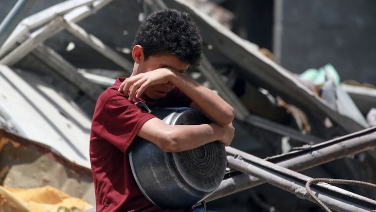 उत्तरी गाजा पट्टी के जबालिया में विस्थापितों के लिए लगे ‘भंडारे’ के बाहर बैठा लड़का